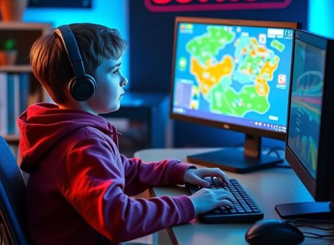 school kid playing game on PC
